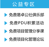 上海易卓公司本著專注、創新、整合、共贏、可持續發展的經營理念,傾力打造并致力于解決企業和職場人士對項目管 理、項目化管理、PMP?系列認證和贏在職場修煉的學習、分享、交友、發展、提升等方面的公益訴求。易卓多年的誠 摯服務經驗積累和眾多知名企業及職場人士的大力支持,共同鑄就這一增值服務與共享共贏的互動社區。
